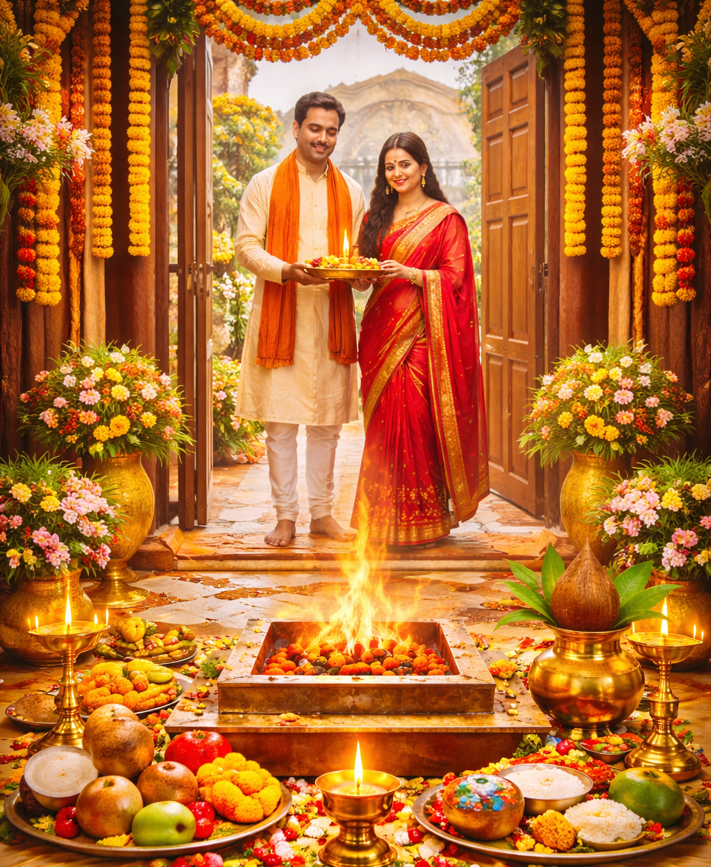 An auspicious Vedic ritual performed before entering a home to purify the space and seek blessings for harmony, health, and prosperity.
